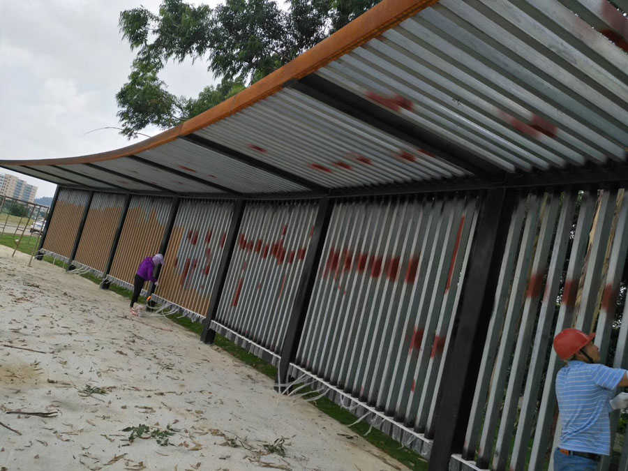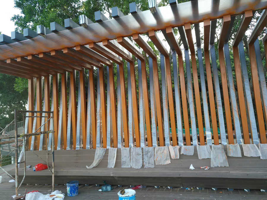 首頁 > 工程案例 > 鍍鋅管木紋漆 > 深圳公明李松萌社區(qū)體育中心廊架木紋漆