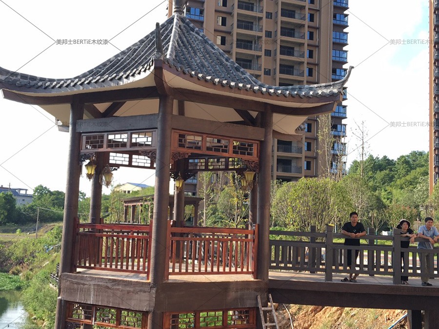 永州江灣半島混凝土涼亭與圍欄木紋漆