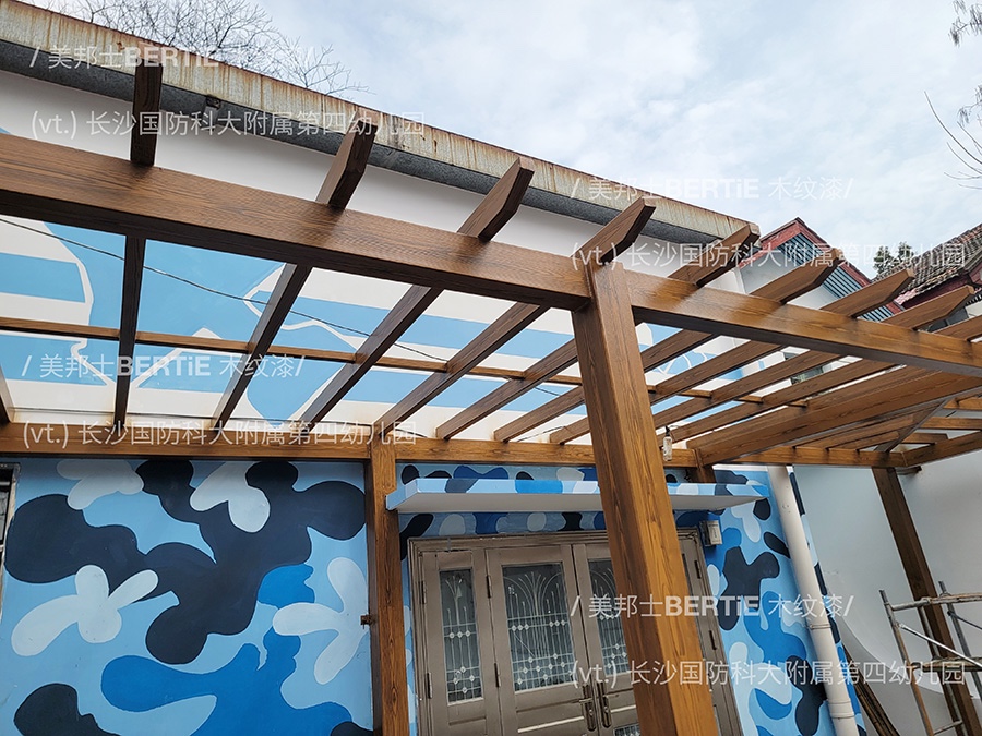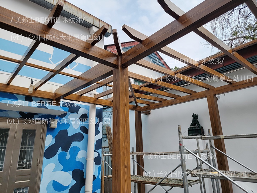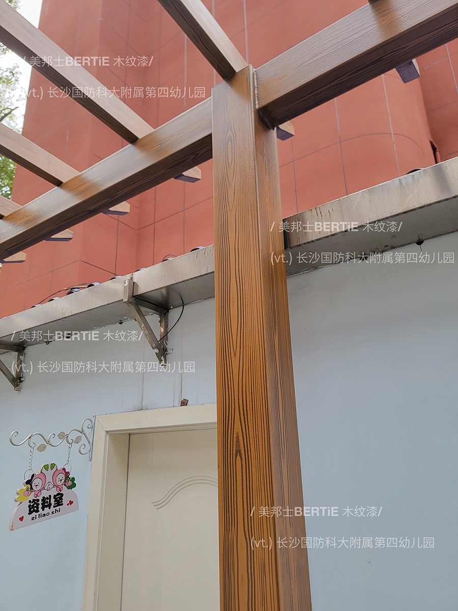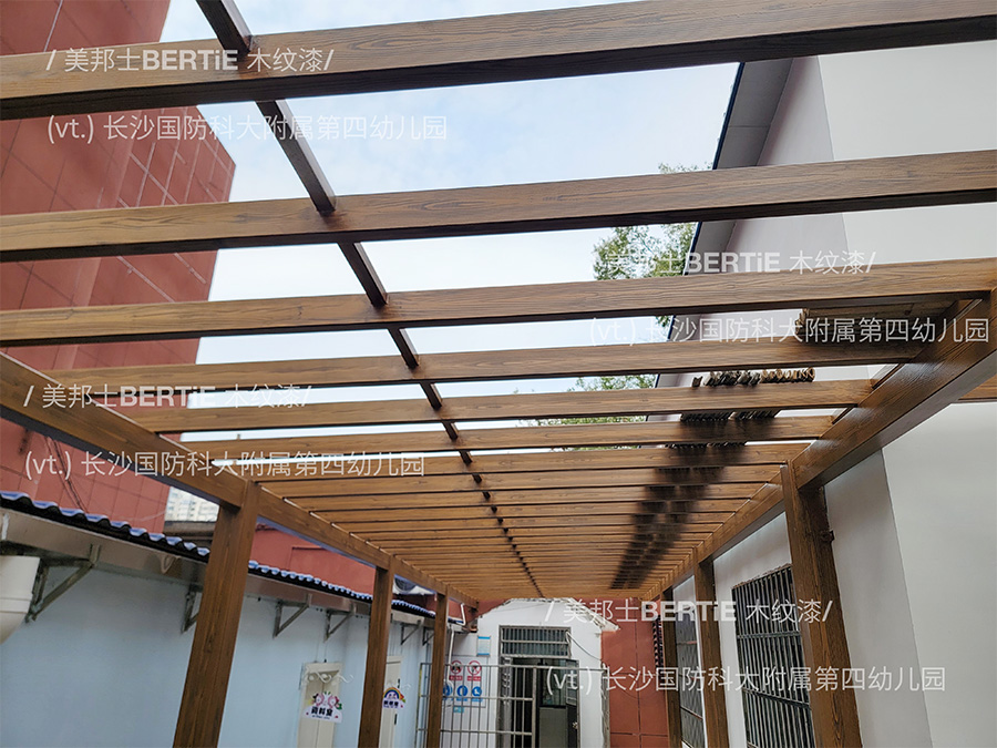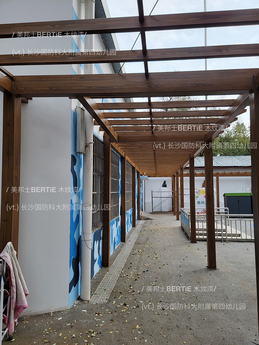 首頁 > 工程案例 > 鍍鋅管木紋漆 > 長沙國防科大第四幼兒園鍍鋅管廊架木紋漆
