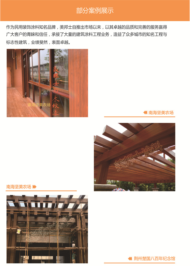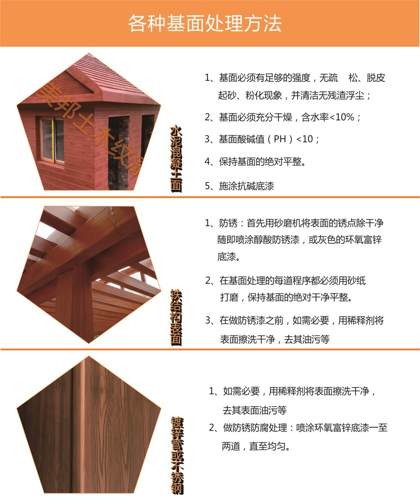 適用于辦公樓、賓館、住宅、廠房等外墻涂裝,車庫上方葡萄架、廊架、鐵架、涼亭等鋼結(jié)構(gòu)木紋外觀涂裝。